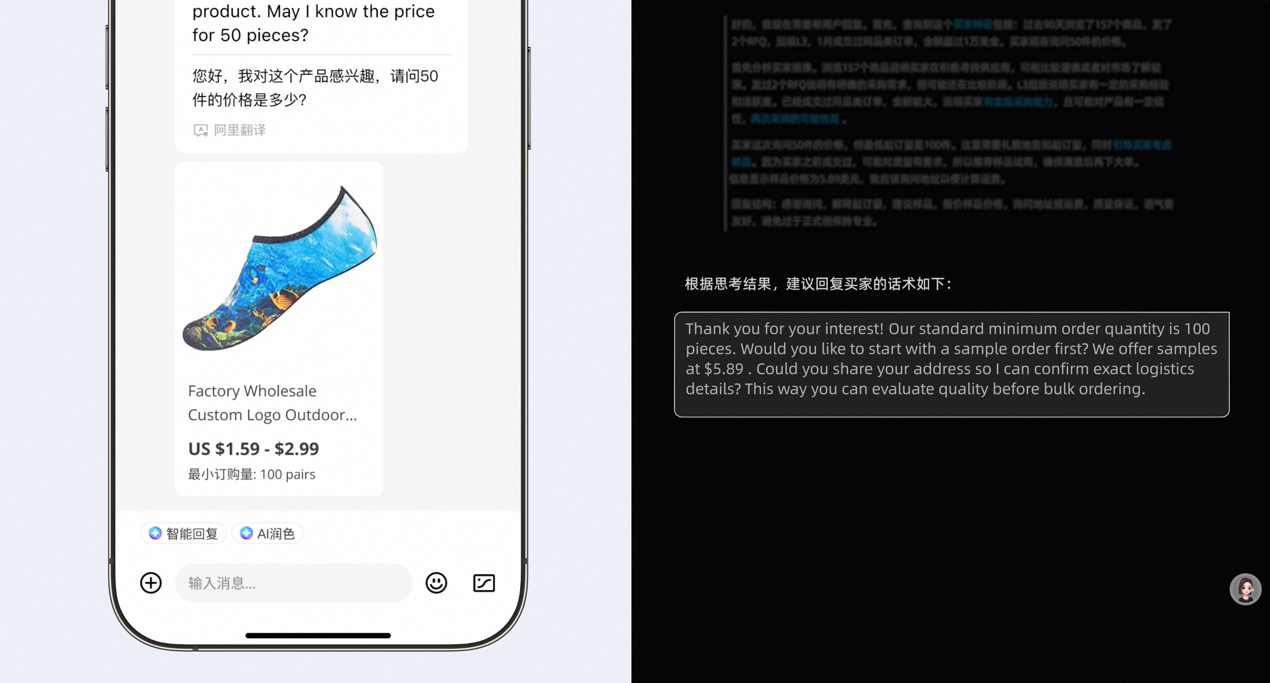 演示中,当买家发来一句:“你好,我对这个产品感兴趣,请问50件的价格是多少?”阿里国际站AI生意助手经过快速地深度推理,结合店铺里的商品信息,会细致地分析:店铺原本设置的最小起订量是100件,买家现阶段可能还没有做好大宗采购准备,给他推荐样品测试比较合适。当AI把这个提议发过去后,对方还真是这样,欣然同意。