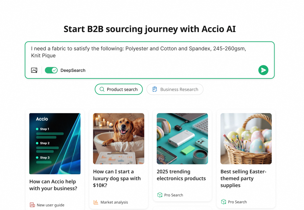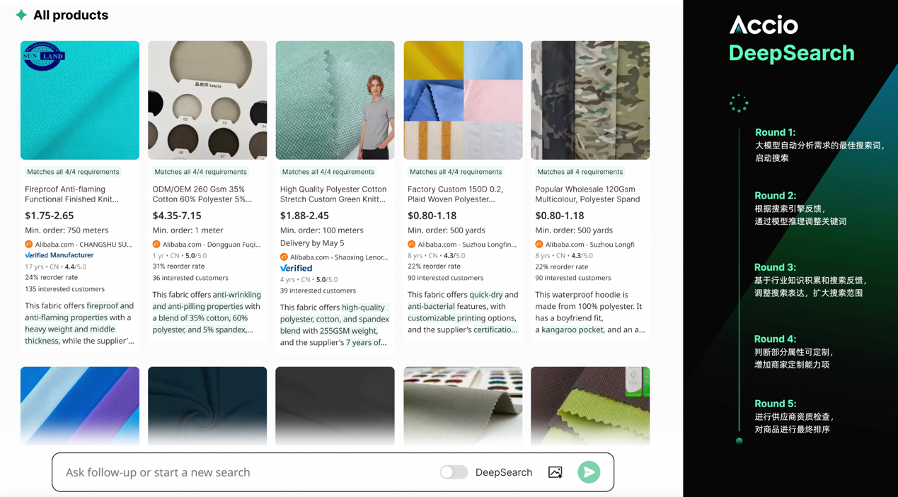 而张阔举的另一个例子,则“朴实”一些,但更能体现Accio在外贸领域的专业性。当一个服饰行业的采购商问Accio想买一些面料,但他对面料已经想得很清楚、具体,就是得由聚酯纤维、棉和氨纶制成,每平方米克重为 245至260,还要有网眼针织纹理。放以往在谷歌里,这么长、这么专业的搜索词,能搜出个啥真不抱希望。